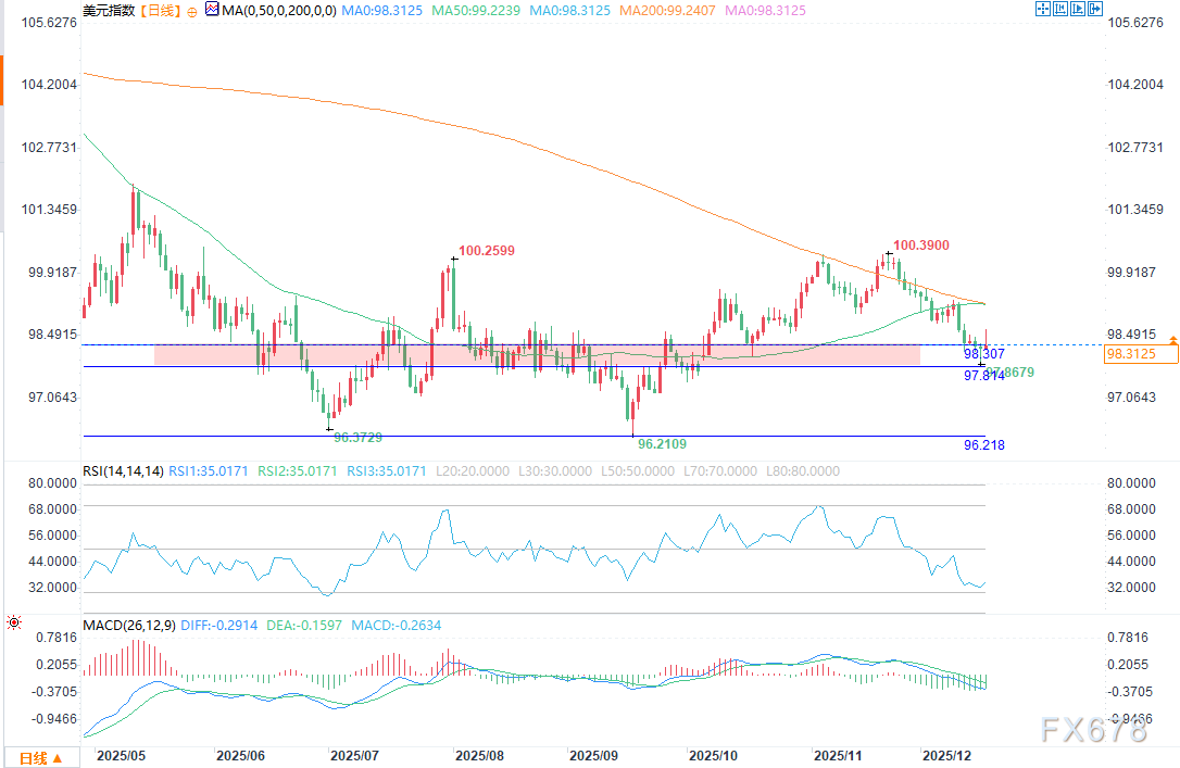 (美元指数日图 来源:易汇通)劳动力市场持续走软,且美联储可能在2026年初调整为宽松货币政策,多重因素令美元承压。若美元指数跌破98.307—97.814这一关键回撤区间,可能引发抛售潮,推动指数加速下探96.218。